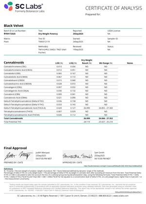 Black Velvet is a genetically balanced hybrid that you will feel. It gives a lazy, sleepy body buzz effect with euphoria and a much better mood. Grab some snacks after you smoke this one, because you are in for the greatest munchies session of your life! Our Black Velvet buds are luscious, tight, and well-formed, with light-olive green and peeks of black. THC-A is a natural cannabinoid found in hemp flower. No conversion or infusion method is used in this product.