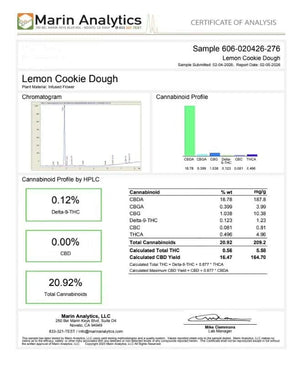 Fresh 2026 Harvest! Lemon Cookie Dough is a vibrant, chunky CBD strain that is perfect on it's own or great as an additive with our other flower. This particular cultivar is talented all around because it has a huge use for all purposes, including edibles! This one will mellow you out and help decompress your day. CBD is a natural cannabinoid found in hemp flower. Due to the low legal limit of Delta-9 THC present in hemp, it is not a psychoactive form of cannabis.